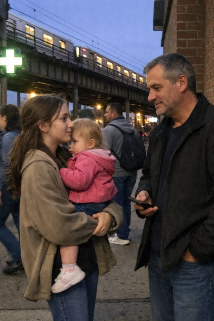 The late afternoon sun hung low over downtown Seattle, turning the glass towers into mirrors of orange light while the streets below pulsed with impatience and motion. Buses hissed at stops, delivery bikes weaved between lanes, and people moved as if they were all late for something important, heads down, shoulders tight, minds elsewhere. On the wide concrete steps outside a modest neighborhood grocery store, a small girl sat very still, as though she had learned that taking up as little space as possible was the safest way to exist.