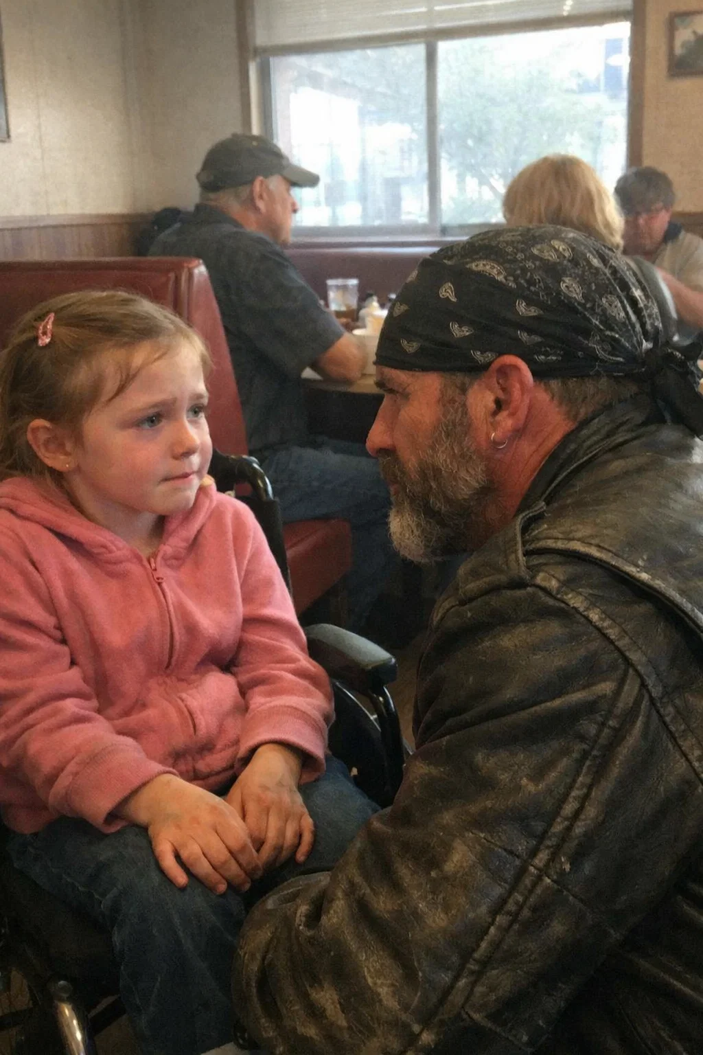 On a late afternoon when the sun leaned low over a tired stretch of highway and the light slid through the dusty windows of a small-town diner like it was trying to warm the place without drawing attention to itself, a single sentence whispered by a child changed more than anyone inside could have imagined. The diner was called Maple Grove Grill, a squat brick building with a flickering neon sign and booths that carried decades of stories in their cracked vinyl, the kind of place people went not because the food was remarkable but because it was familiar, because familiarity sometimes felt like safety. Inside were the usual faces: truck drivers hunched over mugs of coffee that had been sitting too long, retired couples splitting a plate out of habit rather than need, and locals who came every afternoon at the same time, afraid that if they broke routine, something else in their lives might collapse with it.