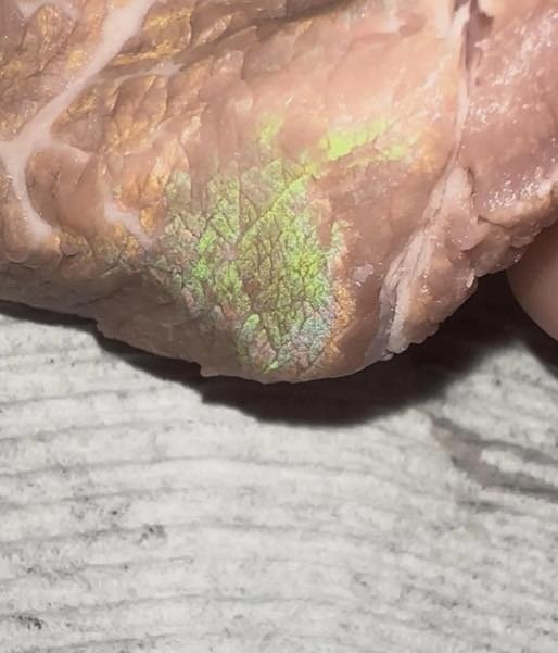 You open the fridge, reach for a slice of roast beef—and freeze. Gleaming across its surface: a shimmering arc of emerald, gold, and violet, like oil on water or a hummingbird’s throat in sunlight. Your mind races: Is this safe? Did it go bad? Did someone… dye it?